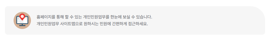 홈페이지를 통해 할 수 있는 개인민원업무를 한눈에 보실 수 있습니다. 개인민원업무 사이트맵으로 원하시는 민원에 간편하게 접근하세요.