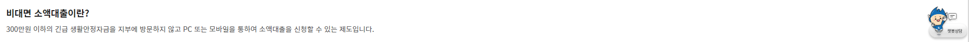 비대면 소액대출이란? 300만원 이하의 긴급 생활안정자금을 지부에 방문하지 않고 PC 또는 모바일을 통하여 소액대출을 신청할 수 있는 제도입니다. 지원대상 신용회복위원회 채무조정을 받아
